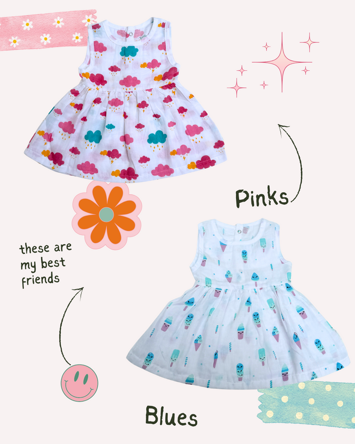 Dress your little one in ultimate comfort and cuteness with our Premium Cotton Baby Frock (Pack of 2) collection. Crafted from ultra-soft, breathable cotton, these frocks are designed to be gentle on delicate baby skin, ensuring all-day comfort. Each set features two adorable frocks with charming prints like honeybee, red cloud, ice cream, and more – making them perfect for everyday wear, playdates, outings, or gifting.