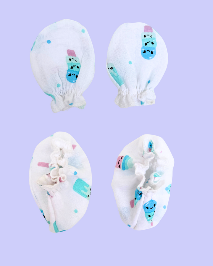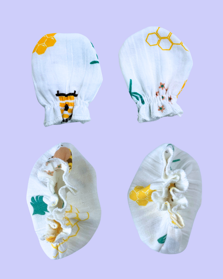 Wrap your little one in cuteness with our themed baby essentials set! Each set includes a matching pair of mittens, booties, and a cap, thoughtfully crafted from soft, breathable cotton to ensure comfort all day long. The playful prints and gentle colors add a touch of charm, while the mark-free elastic provides a secure yet gentle fit. Designed for newborns and infants, these cozy accessories are perfect for daily wear, photo moments, or gifting.